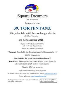 Was ist der Tortentanz: Der Tortentanz ist „das“ Special für Beginner. Es wird im Wechsel Mainstream bis Ferris Wheel (altes Basic 2) & Mainstream 2026 (neues Mainstream) gecallt. Somit können auch Tänzer, die noch nicht das gesamte Mainstreamprogramm beherrschen, an diesem Special teilnehmen. Natürlich ist das Special auch für alle graduierten Tänzer interessant.